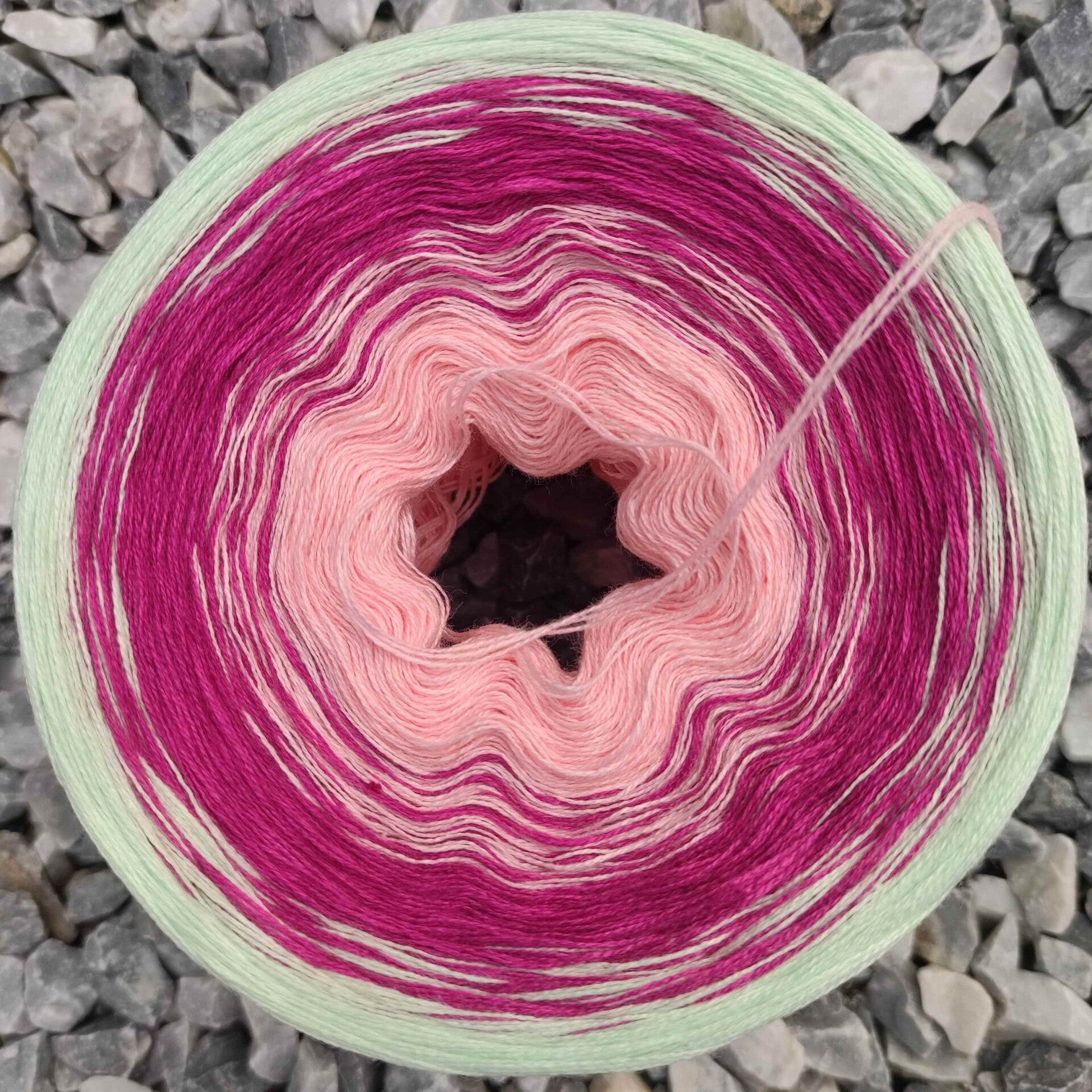 Die Farben laufen nacheinander in die nächste Farbe über , so das ein schöner Farbverlauf entsteht. Ich verbinde das Garn mit sehr kleinen Knötchen die problemlos ein gehäkelt oder eingestrickt werden können, ohne das man sie sieht!